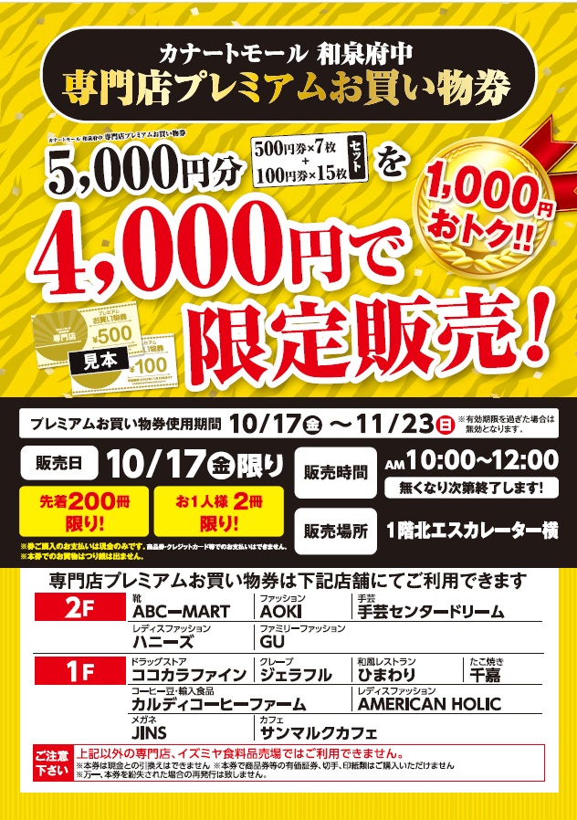 対象の専門店で使えるプレミアムお買い物券を10/17限定販売します。