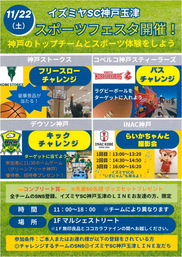 ❝スポーツフェスタ開催❞ 神戸のトップチームとスポーツ体験をしよう!! 【参加条件】ご本人またはお連れ様が ①チャレンジするチームのSNS登録 ②イズミヤSC神戸玉津LINE友だち登録をされている方