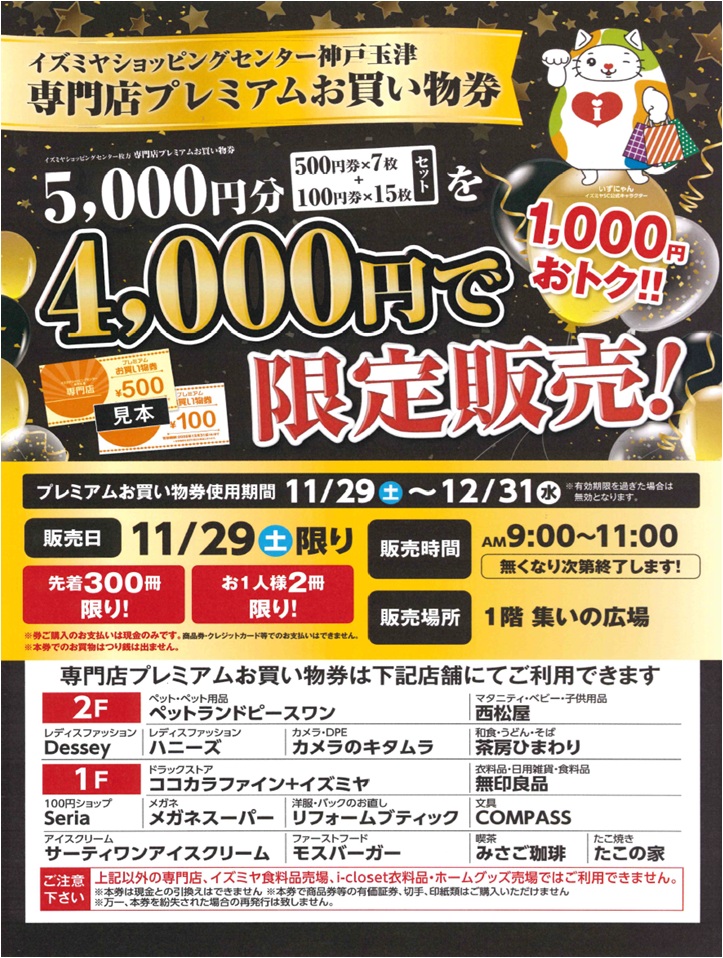 イズミヤSC神戸玉津専門店プレミアムお買い物券 5,000円分を4,000円で限定販売!! ※先着300冊限り! ※お1人様2冊限り!