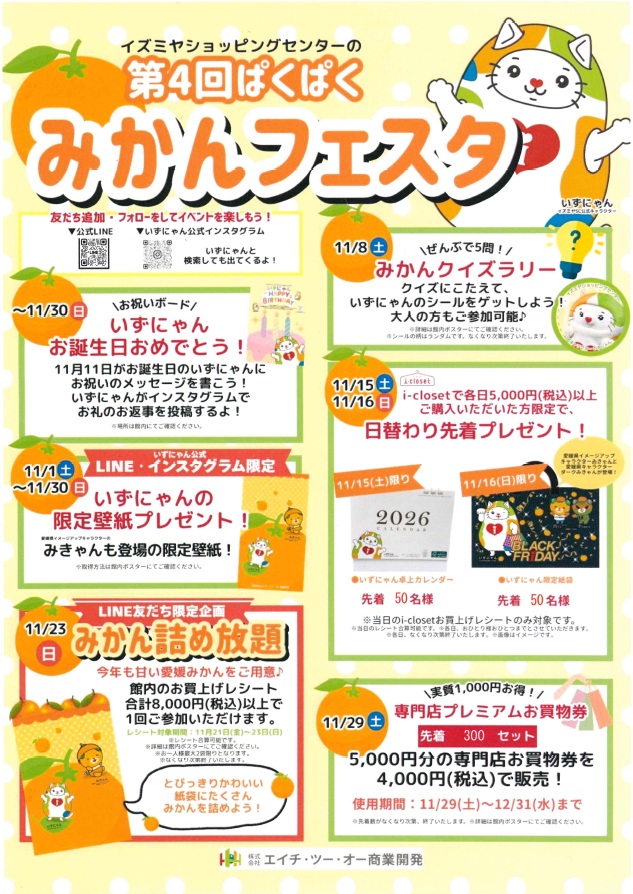 イズミヤSC公式キャラクタいずにゃんがやってくる!! 11/22(土)①13:00~②16:00~ 11/23(日)①10:30~(1回限り)