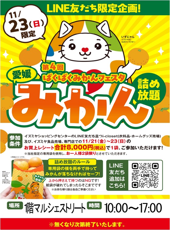 ❝みかん詰め放題❞ イズミヤSCLINE友だちのお客様&11/21(金)~11/23(日)の館内お買上レシート合計8,000(税込)で1袋、ご参加いただけます。 ※お1人様2袋限り