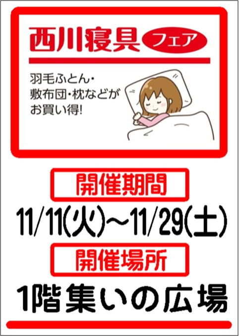 西川寝具フェア!! 羽毛布団・敷き布団・枕などがお買い得!!