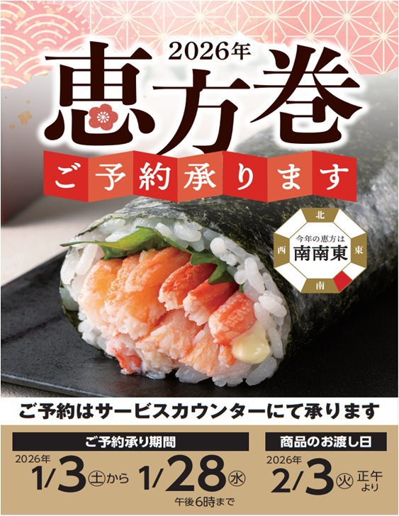 2026年恵方巻のご予約を承ります。 Sポイント対象カード会員様限定 対象商品をご予約いただいたお客様に ボーナスポイントを進呈いたします。 無病息災を願い、どうぞイズミヤでご予約下さいませ。