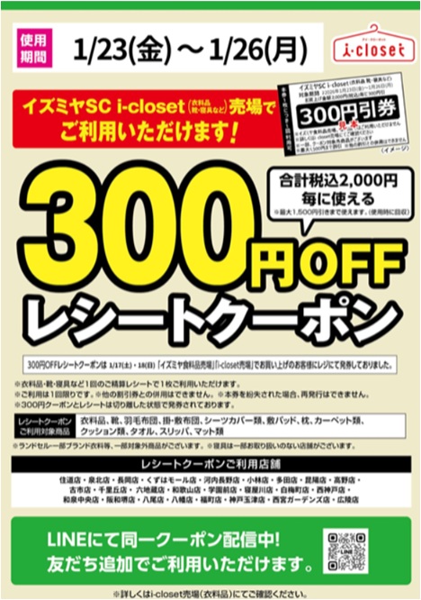 イズミヤSC i-closet売場でご利用いただけるクーポン!! 【使用期間】1/23(金)~1/26(月) 合計税込2,000円毎に使える300円offクーポンです (最大1500円引) LINE友だちのお客様にクーポン配信ありますので、友だち追加お願いします