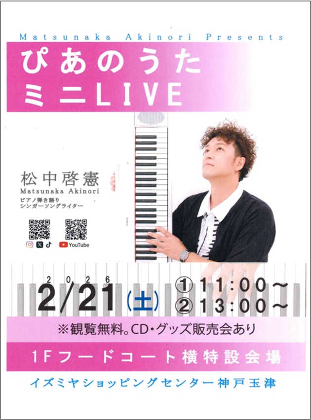 ぴあのうたミニLIVE🎶 松中啓憲さんによるピアノ弾き語り‼️ 観覧無料ですので気軽にお立ち寄りください。