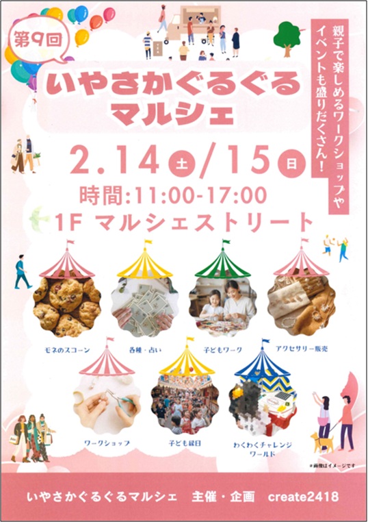 第9回いやさかぐるぐるマルシェ💕 各種ハンドメイド雑貨・子ども雑貨の販売や子ども縁日など 集まる賑わいマルシェを開催します😊