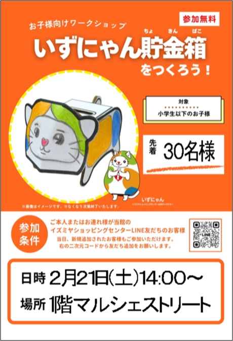 <お子様向けワークショップ> いずにゃん貯金箱をつくろう‼️ 動物型の貯金箱にぬりえができるよ😮
