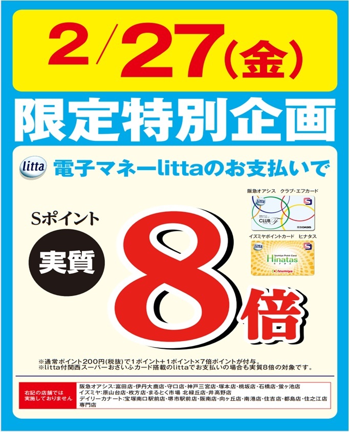 2月27日(金)限定特別企画 クラブ・エフカード、ヒナタスカード搭載の 電子マネーlittaのお支払いで、 litta Sポイント実績8倍と大変お買い得日となっております!