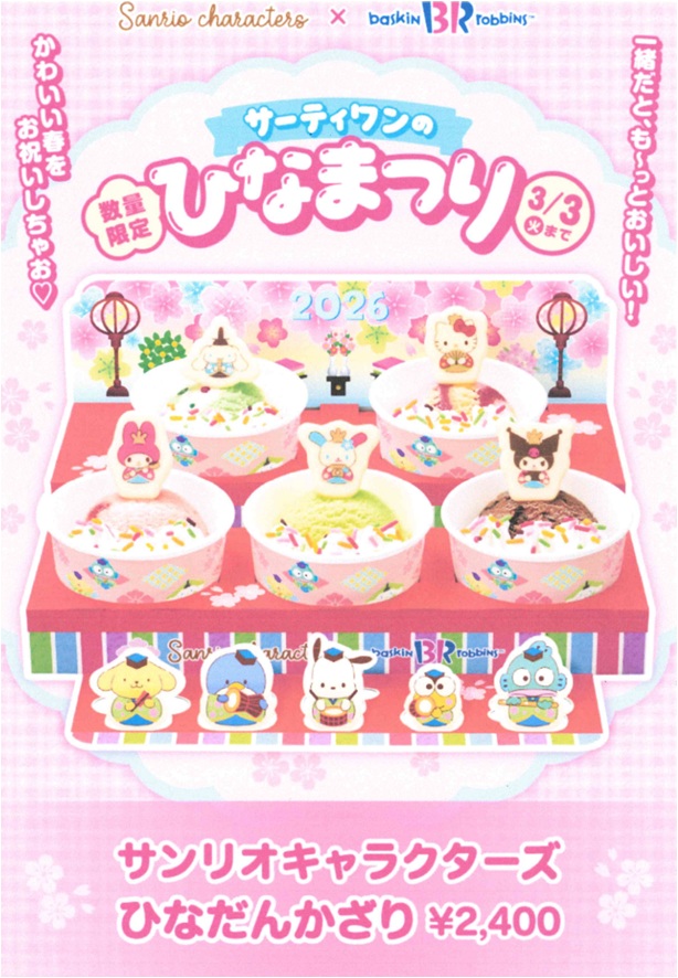 サンリオキャラクターズと一緒にお祝い🎶 サーティワンのひなまつり2026🎎🌸 スモールサイズのアイスクリーム5コとサンリオキャラクターズのひなだんかざりでとってもキュートでにぎやかに🎶 かわいいBOXで持ち帰りして、みんなでひなまつりをおいわいしてね😊