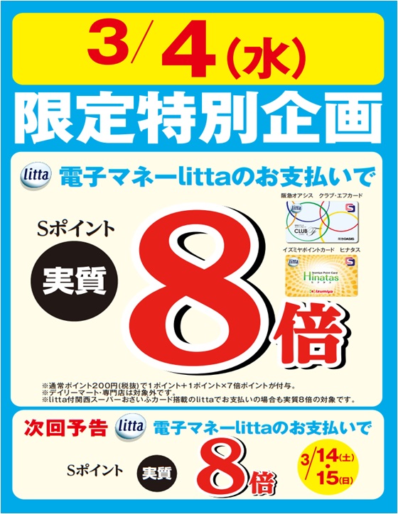 3月4日(水)限定特別企画 クラブ・エフカード、ヒナタスカード搭載の 電子マネーlittaのお支払いで、 litta Sポイント実質8倍と大変お買い得日となっております。