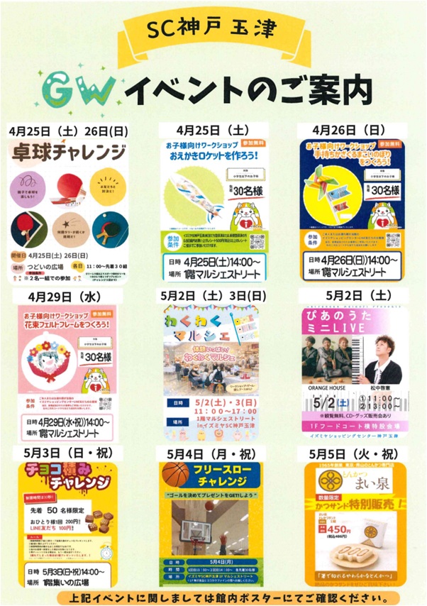 【ゴールデンウィークイベントのご案内】 SC神戸玉津では、4/26(金)~こども・家族・お友だちと一緒に楽しめるイベント盛りたくさん🎶😊 みんなで一緒に楽しみましょう🙌