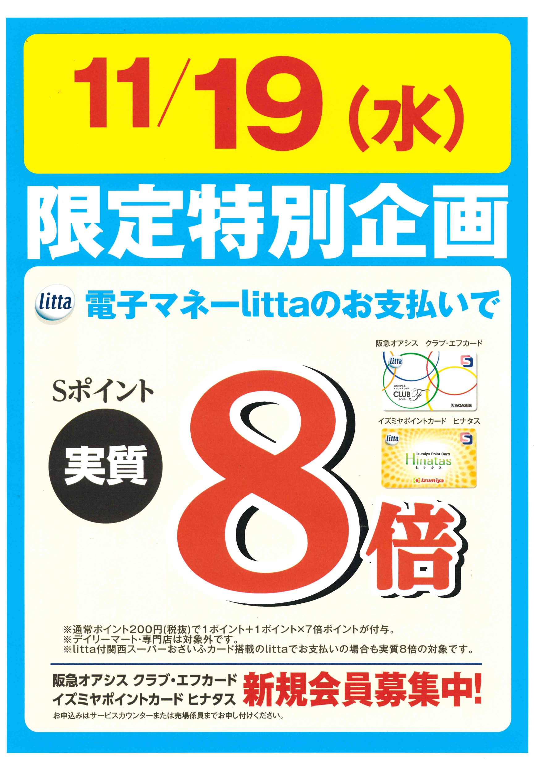 イズミヤ「ヒナタス」カード搭載の電子マネー【litta】でのお支払いでSポイントが実質8倍!