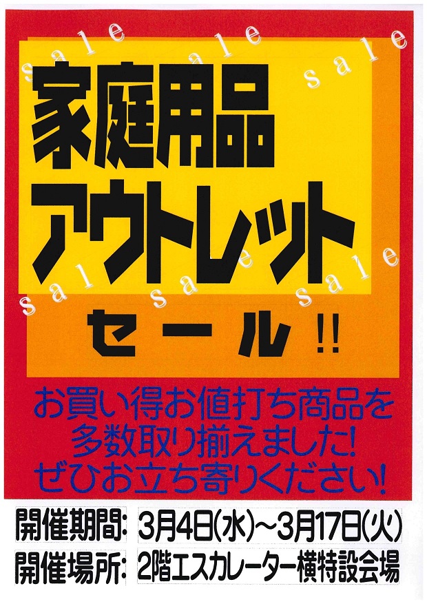 家庭用品アウトレットセールを開催します! お買い得お値打ち商品を多数品揃えしました。 欲しいものがきっと見つかる! ぜひお立ち寄りください。