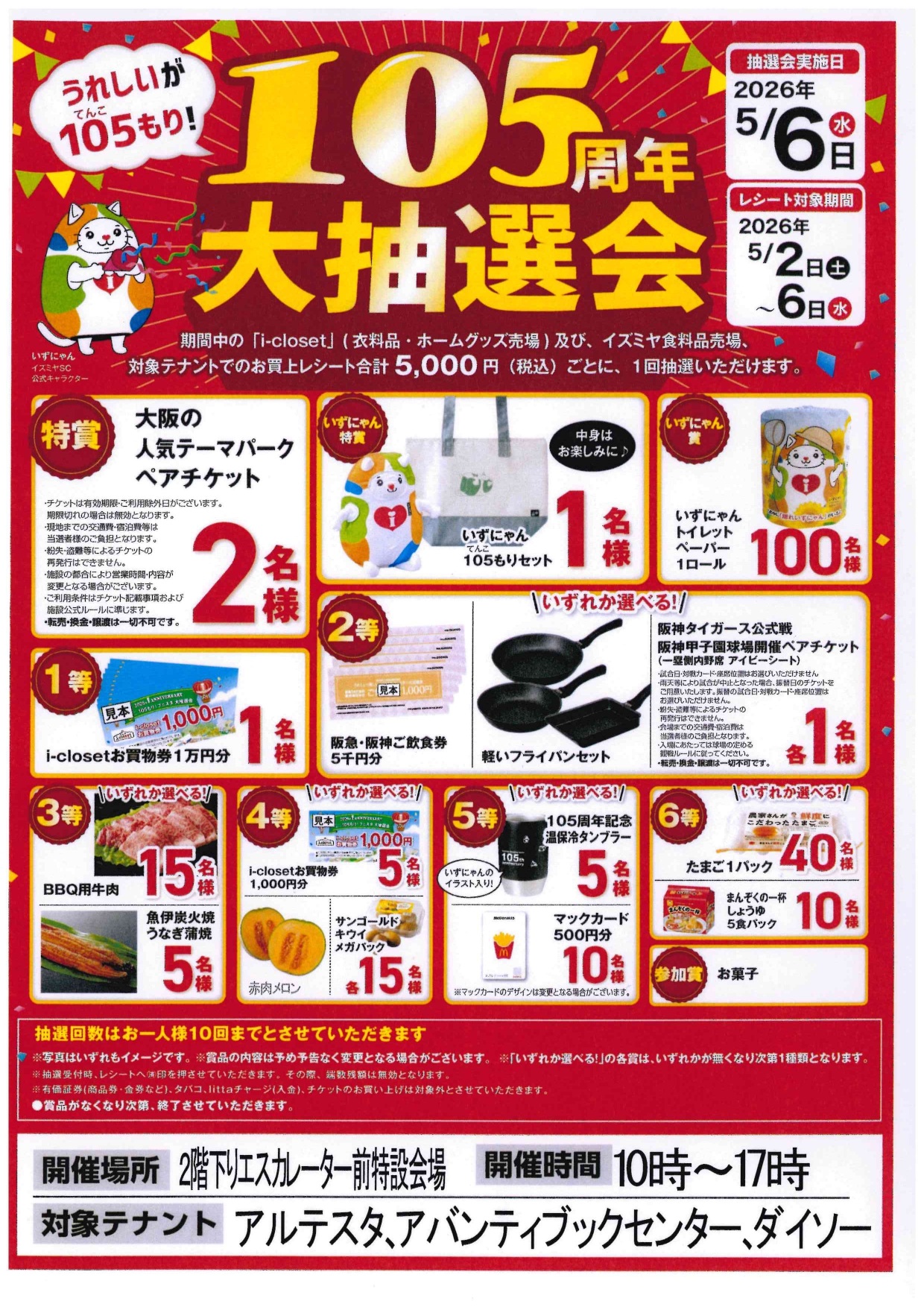 創業105周年を記念してうれしいがてんこもり!の大抽選会を開催します。 特賞は大阪の人気テーマパークのペアチケット! 期間中の「i‐closet」(衣料品・ホームグッズ売場)、イズミヤ食料品売場、対象テナントでの お買上げレシート合計5,000円(税込)ごとに1回抽選いただけます。 期間中の対象レシートなら合算可能です。 *お一人様最大10回までとさせていただきます。 ぜひ、この機会に当館でのお買い物をお楽しみください!