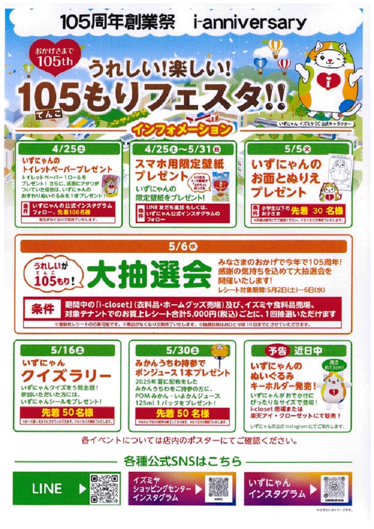 4月25日(土)~5月31日(日)の期間中、公式LINE又は公式インスタグラムの二次元コードから今しかもらえないイズミヤSC公式キャラクター『いずにゃんのスマホ壁紙』をゲットして携帯の壁紙にしてね!!