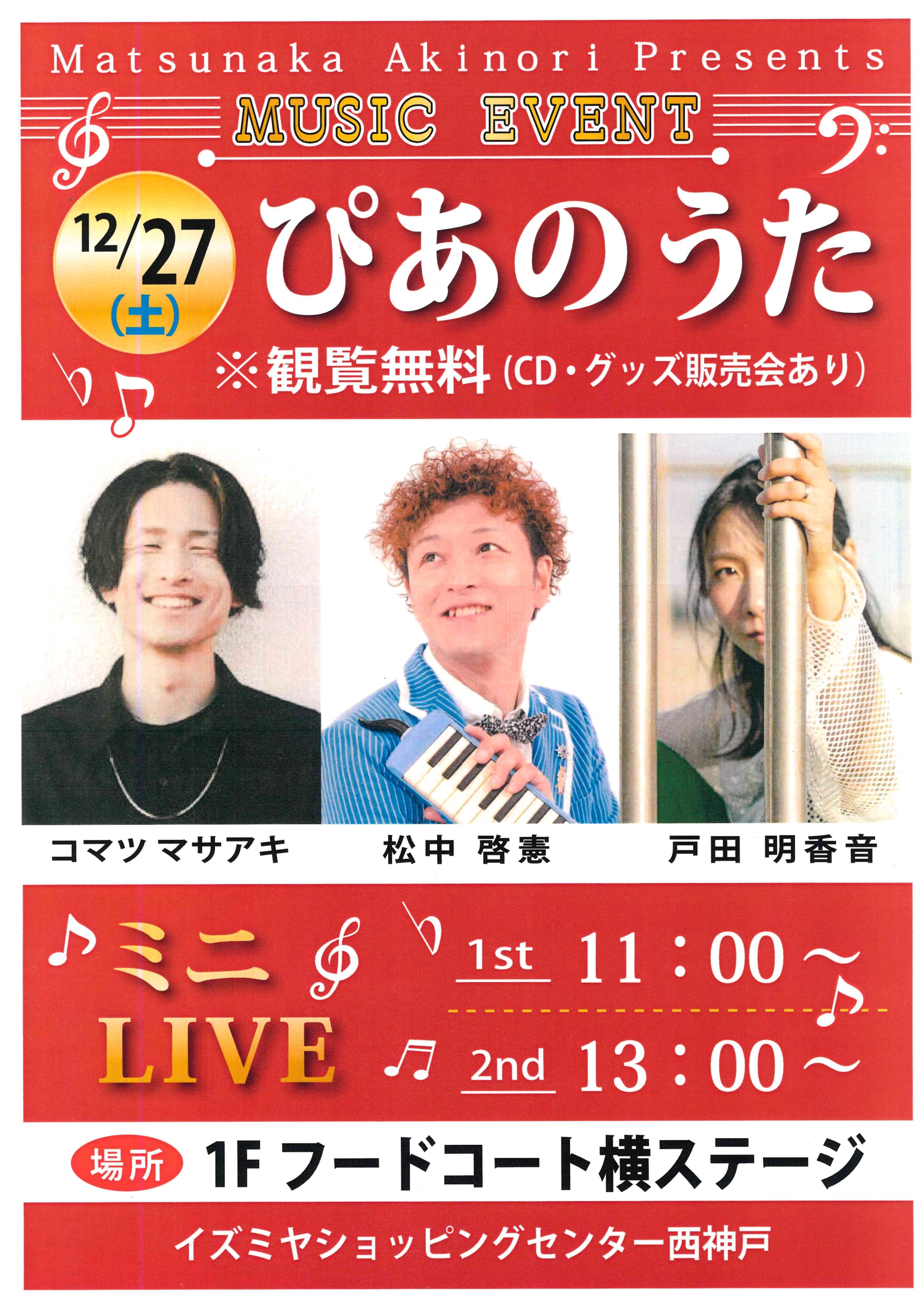 1階フードコート横ステージにて、ぴあのうた(コマツ マサアキ&松中 啓憲&戸田 明香音)のミニライブを開催いたします🎵