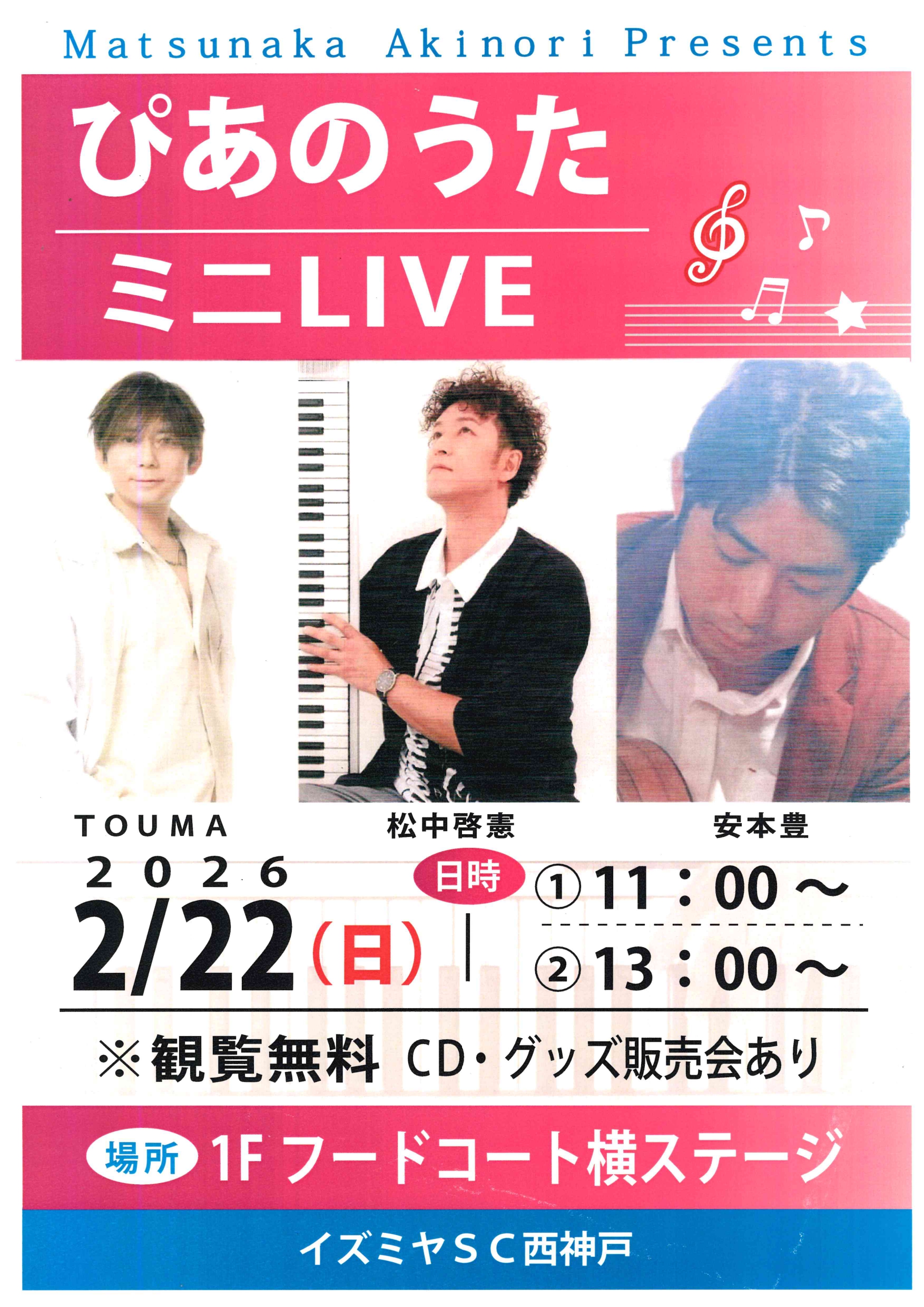 1階フードコート横ステージにて、ぴあのうた(TOUMA&松中 啓憲&安本 豊)のミニライブを開催いたします🎵