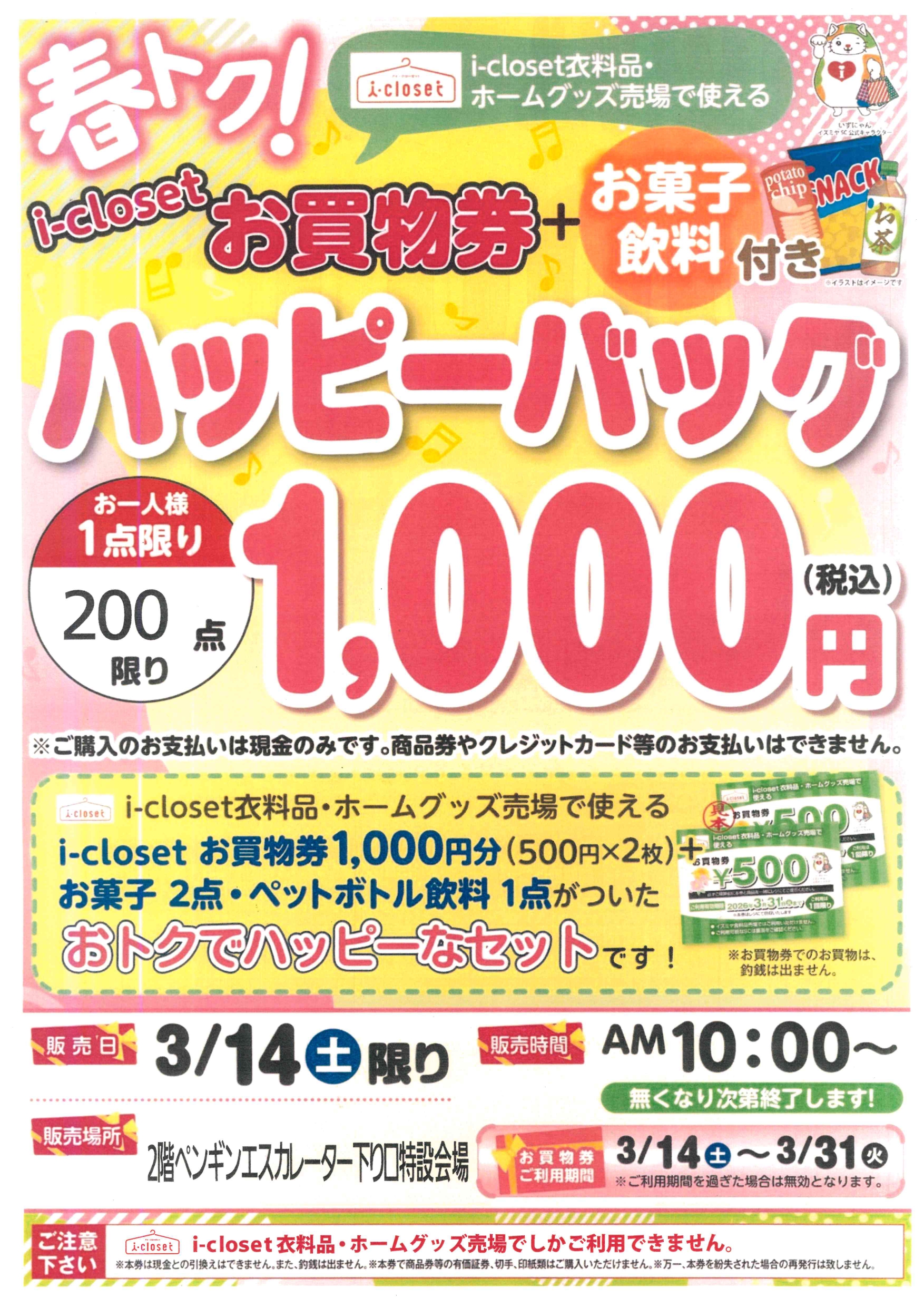 i-closet衣料品・ホームグッズ売場で使えるi-closetお買物券🎫+お菓子飲料付き🍫🥤ハッピーバック🛍️を販売いたします。✨