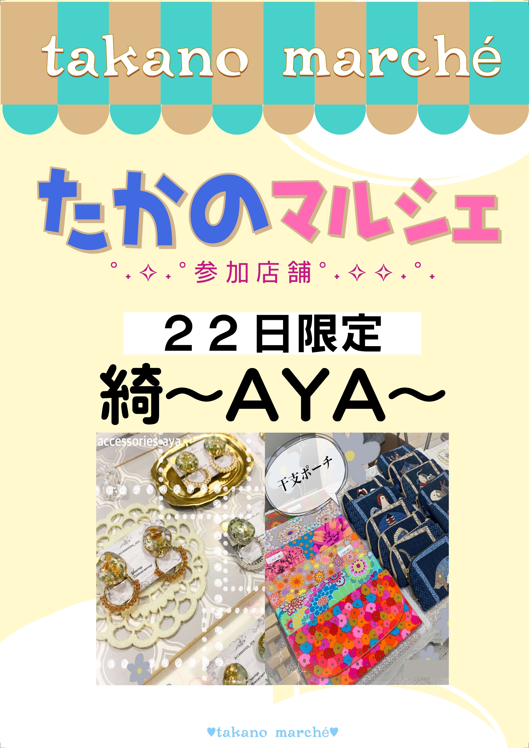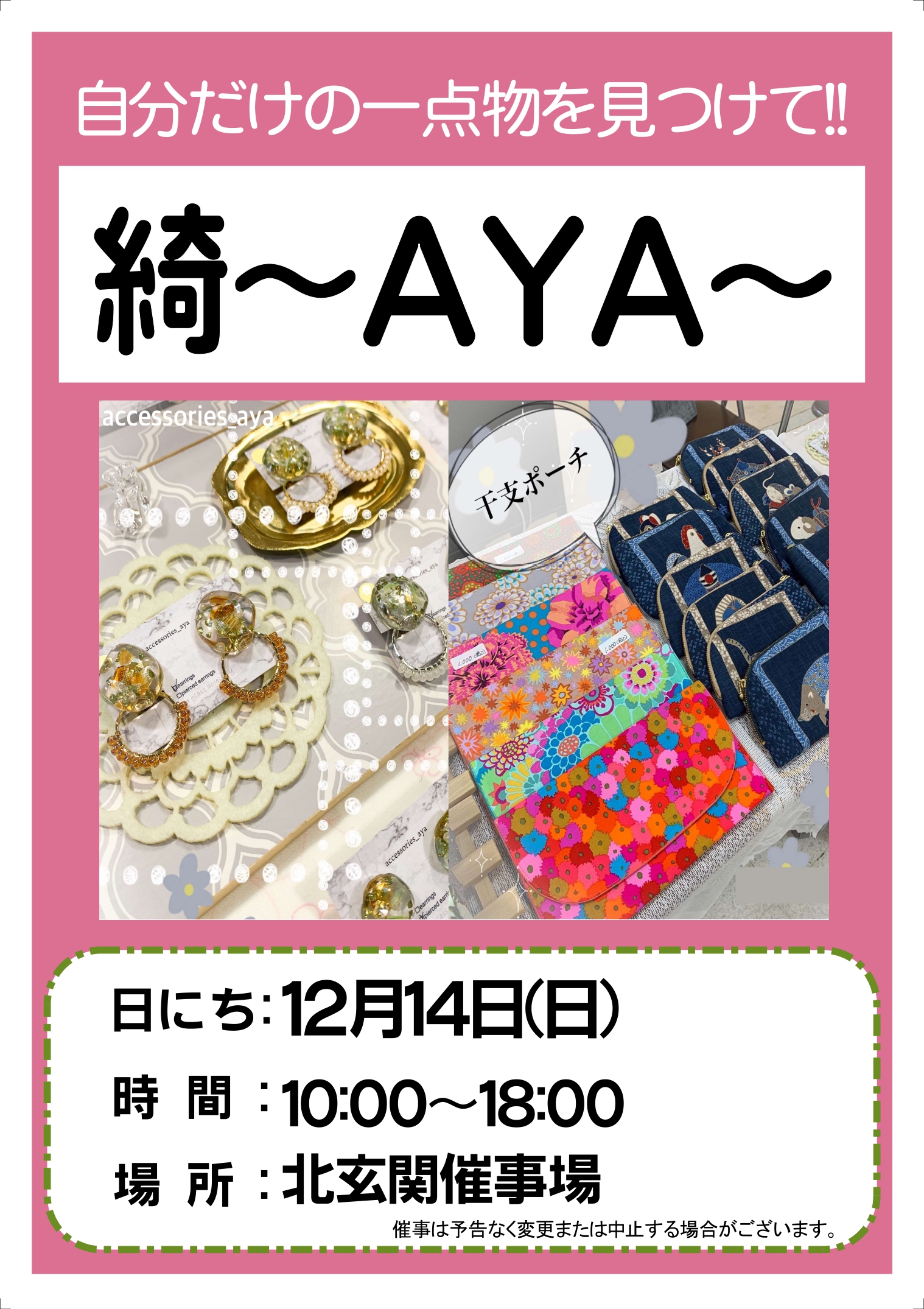 オリジナルアクセサリー&小物雑貨創作で人気の『綺~AYA~』が出店します❤️
