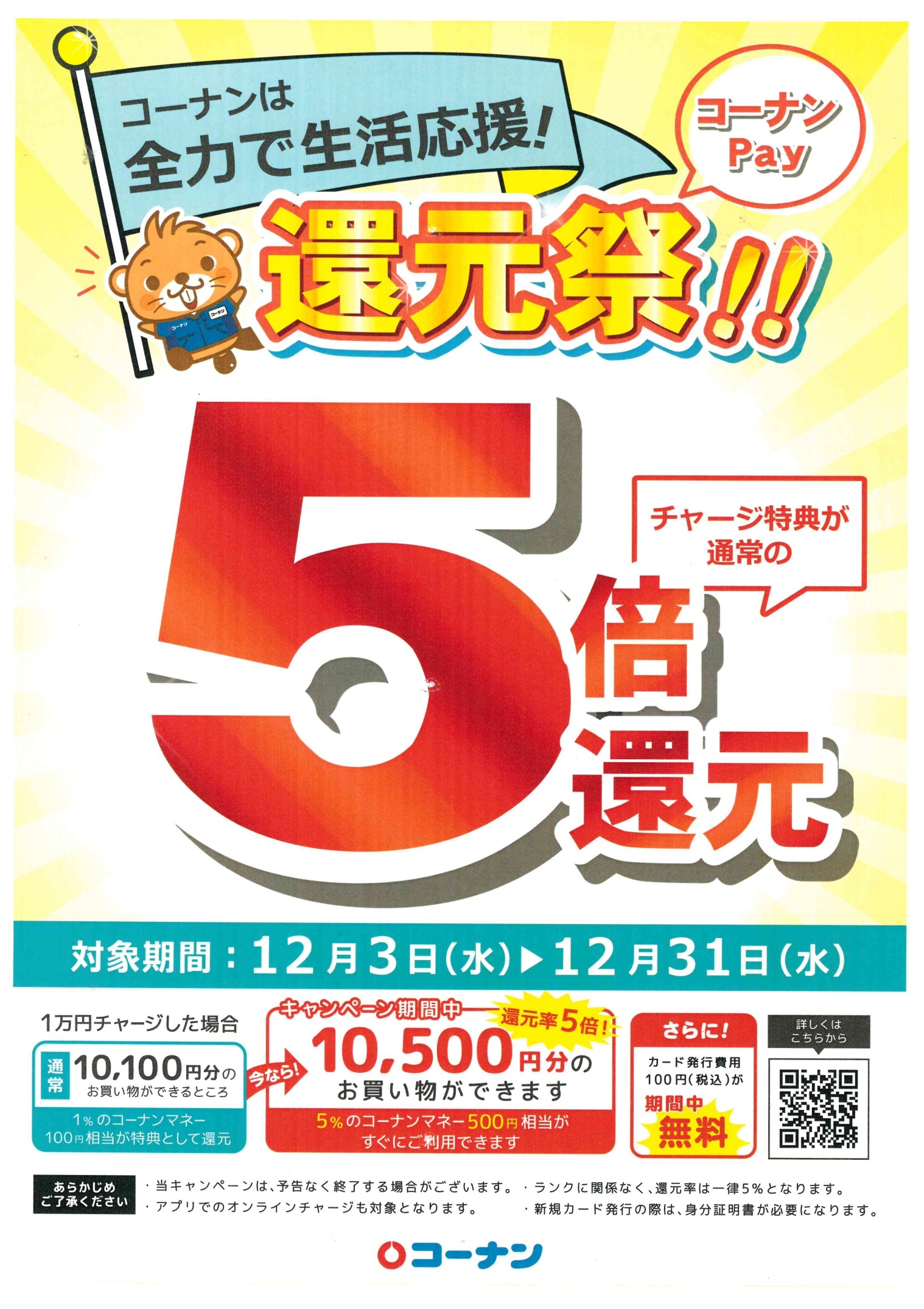 期間中、コーナンPayにチャージするとチャージ特典が通常の5倍の、お得なキャンペーンです📢