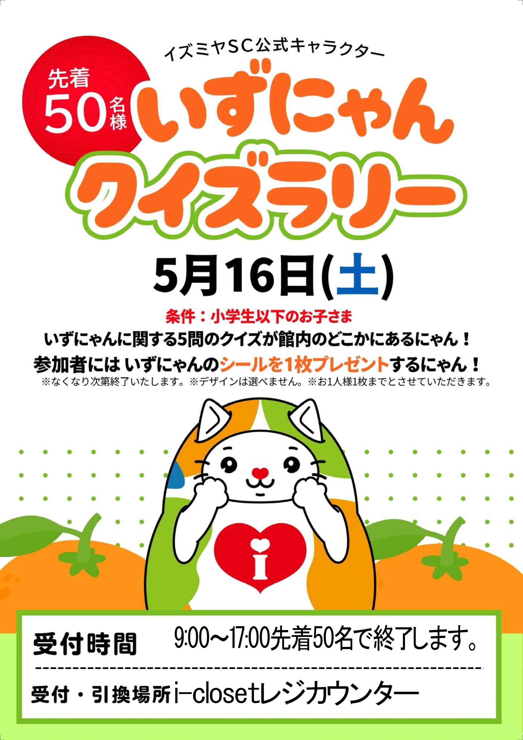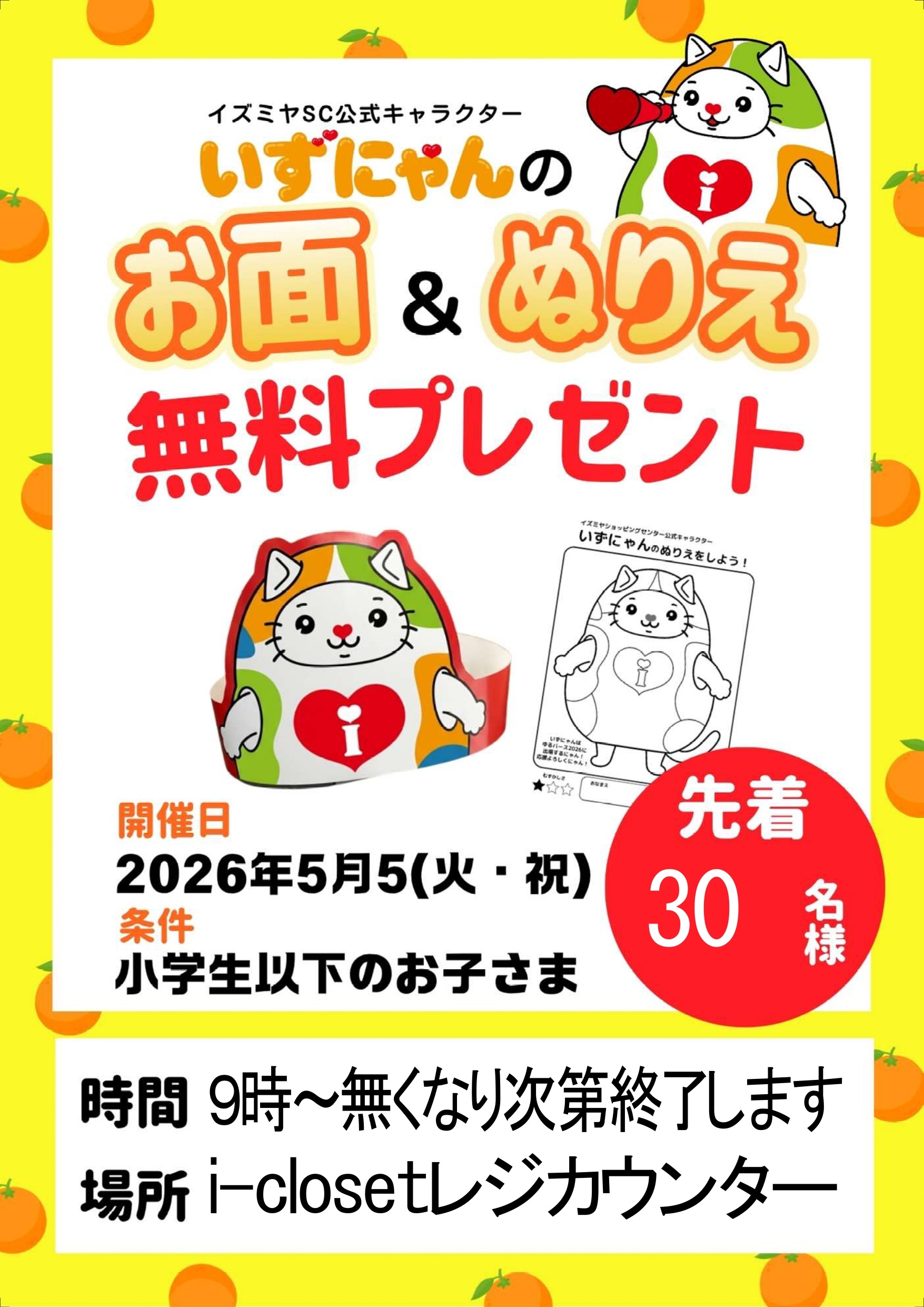 イズミヤショッピングセンターの公式キャラクター いずにゃんのお面&ぬりえを無料プレゼントいたします。