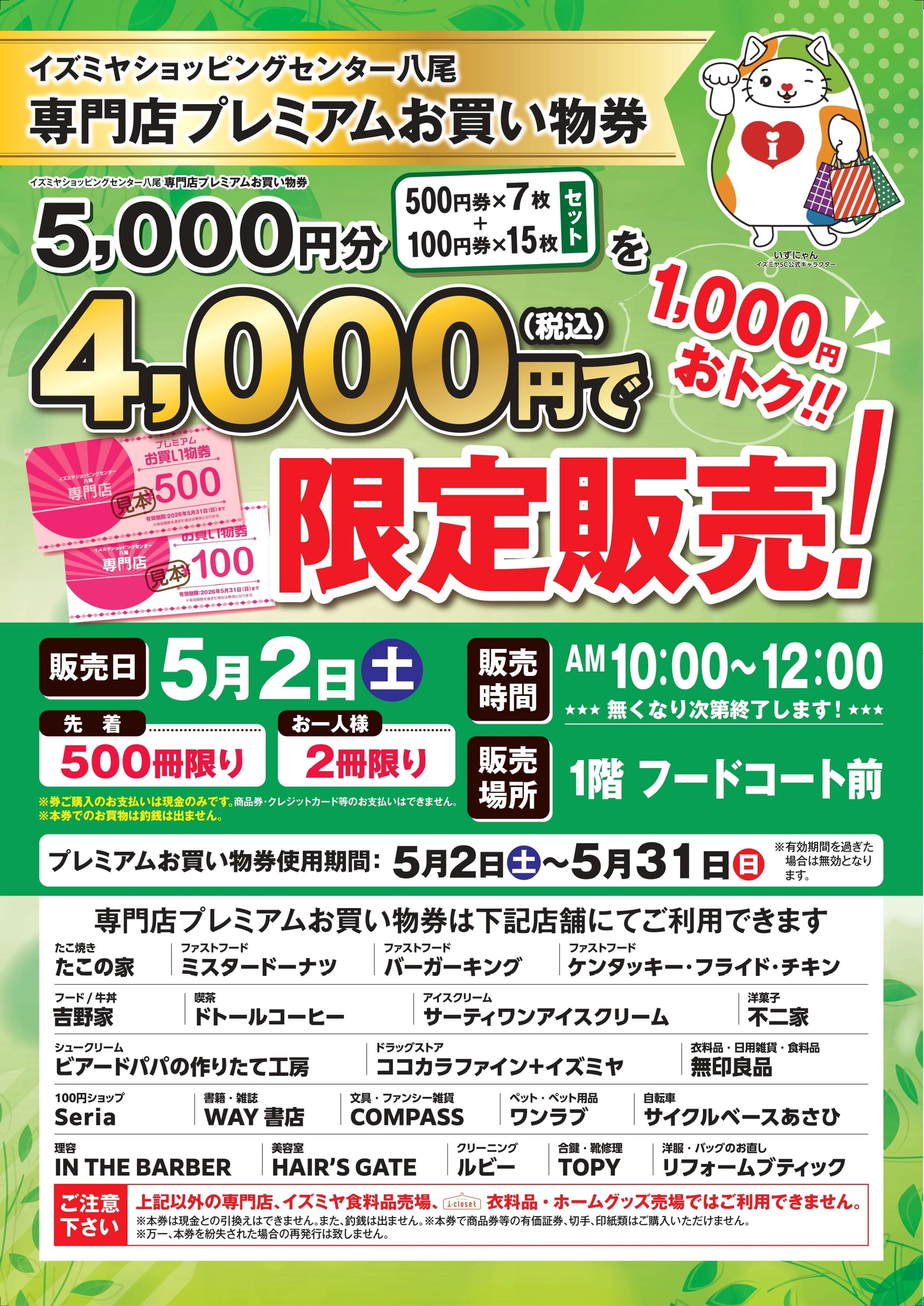 イズミヤショッピングセンター八尾の専門店で使用できる5000円分のプレミアム商品券を4000円にて販売いたします。
