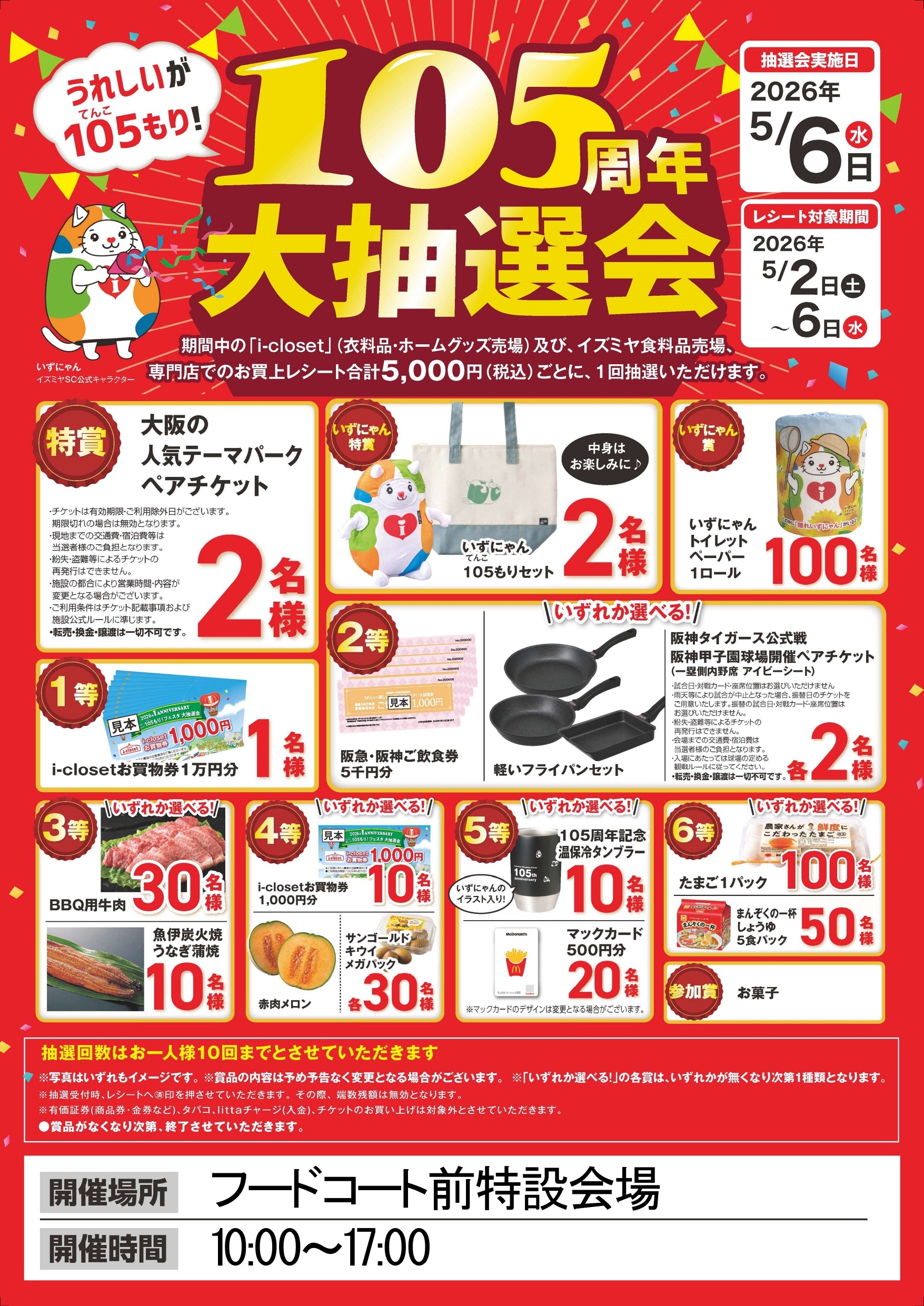 5月2日(土)~6日(水祝)までの当館のi-closet衣料品・ホームグッズ、イズミヤ食料品売り場、全館の専門店のレシート5000円(税込み)ごとに1回抽選いただけます。(合算OKです、お一人様10回までとさせていただきます。宝くじ・ココカラ調剤薬局・レシートの出ないニコパは対象外となります。)皆様どうぞご利用ください。